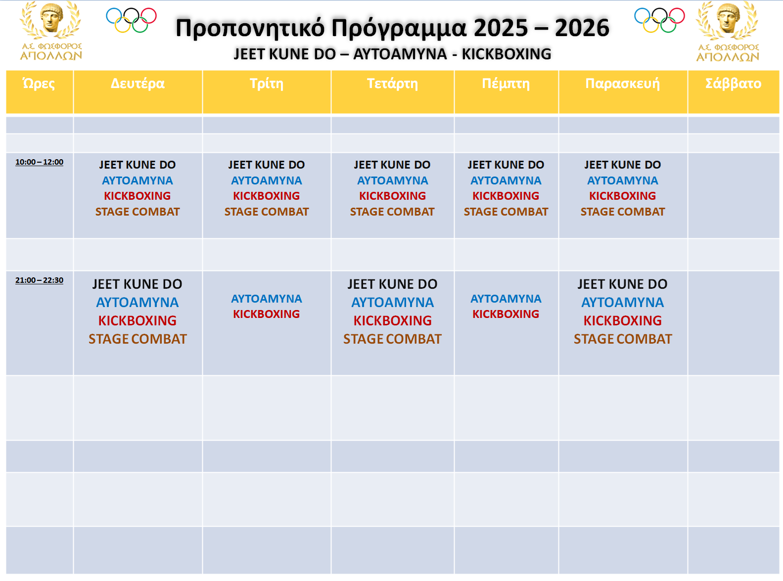 Η Αυτοάμυνα μέσω της μαχητικής Τέχνης του Jeet Kune Do (Way of the Intercepting Fist, Τζιτ Κουν Ντο)το οποίο δημιουργήθηκε από τον θρυλικό Bruce Lee (Μπρους Λη), αποτελεί μία σύγχρονη πολυμορφική μαχητική τέχνη με στόχο την ρεαλιστική εξοικείωση του μαχητή σε όλα τα πεδία μάχης (Ranges: Kicking, Punching, Trapping, Standing Grappling, Ground Fighting) και στην ανάπτυξη των μαχητικών δεξιοτήτων μέσω ουσιαστικής τεχνογνωσίας και έκθεση σε σύγχρονες προπονητικές μεθόδους.